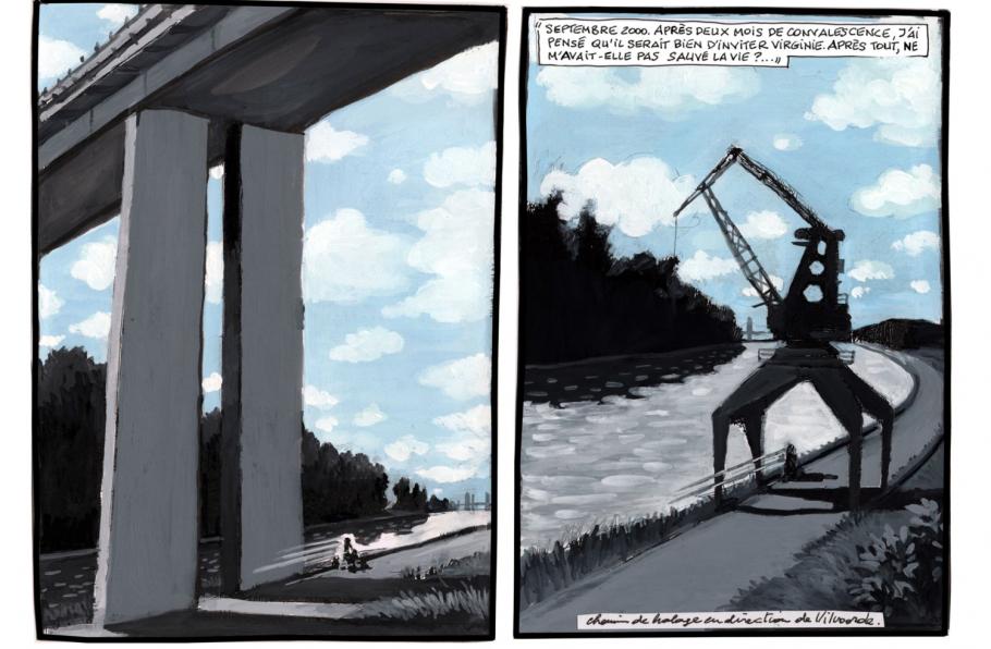 Ce «tout», qui mêle, comme elle aime à le faire depuis toujours, la pure fiction à un réel très documenté mais aussi aux «vrais gens» et à un fond social, économique et ici industriel –qui, là encore, l’a un peu éloignée de la BD bourgeoise voire aristocratique de ses congénères de Saint-Luc– n’avait besoin que d’un bon script doctor pour enfin voir le jour. Jean-Claire Lacroix l’a trouvé en la personne de Séraphine Claeys, dessinatrice elle aussi née à Saint-Luc dans le sillon du 9e Rêve. Elle a accompagné Jean-Claire Lacroix dans ce grand accouchement, et en parle très bien: «Ce qui m’a frappée en premier lieu dans le dessin de Jean-Claire, c’est le noir et blanc, l’atmosphère et les ambiances de pluie. Cette petite pluie collante à la Simenon, la lumière pâle des phares et des réverbères, la solitude des personnages. Sa façon de regarder, de saisir quelque chose au plus profond de l’âme humaine sans avoir l’air d’y toucher, c’est son style.»