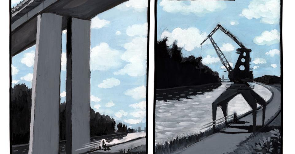 Restée longtemps aux marges du succès et des gros éditeurs, multipliant longtemps les expériences, les métiers et les pratiques artistiques (elle a bossé dans la presse et la com’, a pratiqué le dessin de presse, la mise en page, le graphisme, la peinture…) et même « dégoutée par la bande dessinée, j’y ai renoncé pendant des années», Jean-Claire Lacroix est toujours là, et bien là. Presque 20 ans après Route 54 aux éditions CFC, un récit-documentaire en BD dans lequel elle suivait le parcours et les utilisateurs de la ligne de bus n°54 («longtemps la plus longue de tout le réseau bruxellois, de Forest à Machelen»), elle publie enfin, et en trois grosses et belles tranches, les aventures de Lucien néons, elles-mêmes inscrites dans le projet plus vaste encore de Banal canal, dans lequel elle explore l’âme et l’histoire du canal de Bruxelles et de ses environs. Une œuvre rare, impressionnante et inclassable, probablement comme son autrice. Laquelle a enfin trouvé sur son long chemin de croix le peu de sororité qu’il lui manquait pour faire atterrir ce projet.