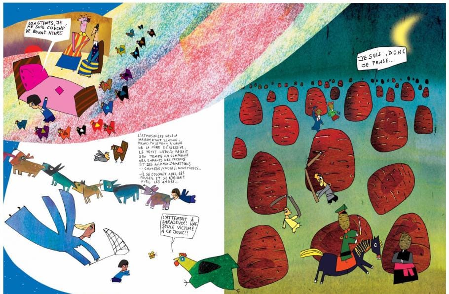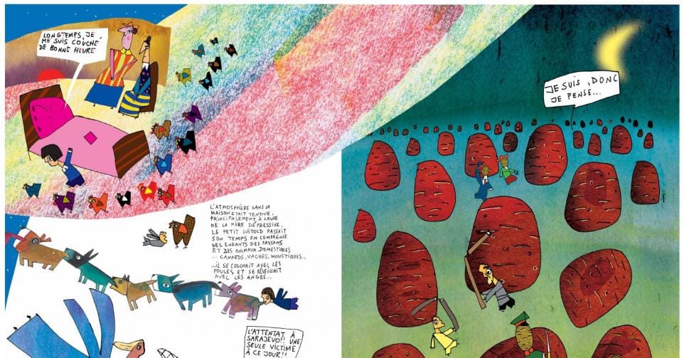 Bref, un personnage, un monstre de la littérature et un témoin de son temps dont la veuve, dévouée à son œuvre, rêvait depuis très longtemps d’un Witold en bande dessinée. Elle a obtenu mieux que ça avec ce Moi, Gombrowicz, qui mêle avec une étonnante fluidité et une forme rarement, voire jamais, vue une chronologie rigoureuse, des textes parfois très fictionnalisés du documentaliste Andrzej Wolski, des extraits du Journal de Gombrowicz lui-même et surtout, surtout, de grandes illustrations de Wozniak, au sommet de son art lui aussi très singulier. L’illustrateur, peintre et caricaturiste polonais, qui dut lui-même s’exiler à Paris, est depuis des décennies et, entre autres, une plume reconnaissable entre mille du Canard enchaîné, quand il ne promène pas ses personnages filiformes dans l’univers de la musique –on garde ainsi précieusement son Sibérie m’était contée, livre/CD et culte réalisé avec Manu Chao en 2004. Jacek Wozniak s’offre ici un espace de création d’une ébouriffante liberté, avec des centaines de dessins hauts en couleur et en formats, qui dictent deux impératifs au sortir de ce Moi, Gombrowicz: redécouvrir les livres de cet auteur qui rappelait Rabelais, mouchait Sartre mais annonçait Houellebecq, et ne pas rater l’exposition des dessins originaux de Wozniak qui devrait se tenir à la prochaine Foire du livre de Bruxelles.