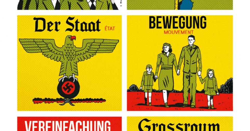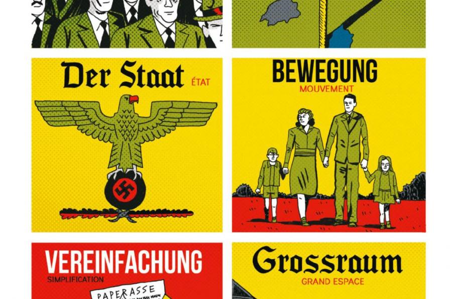 «Un complément plus qu’une adaptation»: l’auteur de Léonard Cohen. Sur un fil (Caterman 2021) ou Le Prince des oiseaux de haut vol (La Pastèque, 2024) ne s’est en effet pas contenté de mettre en dessin la démonstration de Chapoutot; Philippe Girard y intègre d’abord le récit de Florence, cadre dans une grande entreprise californienne de la tech, un rêve qui se transformera, de chapitre en chapitre –et avec à chaque fois, tout un symbole, une couleur en moins– en effondrement. Une «vraie» fiction, fluide, entrecoupée par le contenu parfois rugueux et scolaire de l’essai de Chapoutot, mais pour lequel Philippe Girard détourne cette fois l’imagerie, l’esthétique et l’iconographie nazie. Des images et un contenu alors soudain encore plus forts et marquants, à l’image de la couverture qui évoque à la fois une swastika et une roue de hamster, et qui là aussi, comme son titre, en dit beaucoup sans rien nommer.