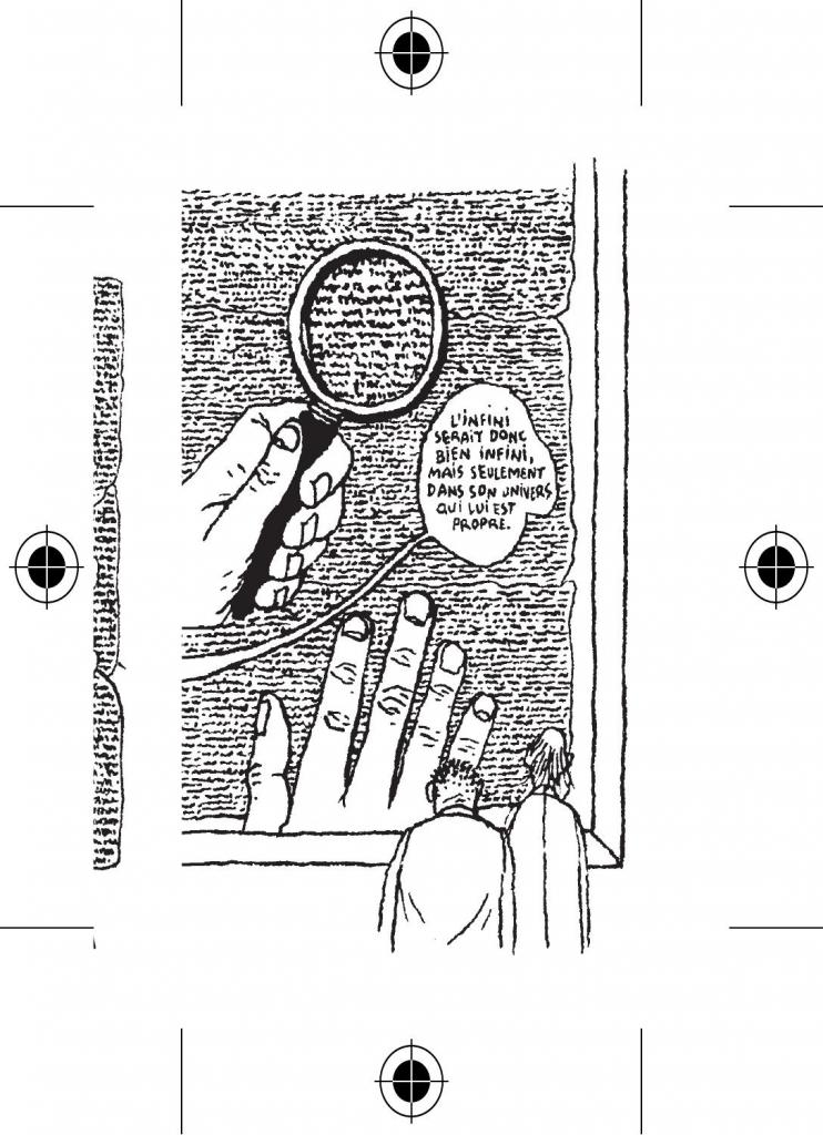 «L’infini est, de toute évidence, immense, écrit l’auteur dans sa micropréface. Mais cela paraît moins vrai quand il est minuscule. Il y a là une singularité que cet opuscule tente d’explorer, parmi d’autres curiosités.» Dont acte: dans ce récit étrange mais reconnaissable immédiatement par tous ceux qui suivent l’œuvre de Marc-Antoine Mathieu depuis sa série Julius-Corentin Acquefacques, un philosophe et un physicien glosent sur le sujet de l’infini et sur les rapports entre immense et minuscule, dans un jeu de langage là aussi typique de l’auteur: «Au final, c’est quoi l’infini? La non-réponse est dans votre oxymore!» Un dialogue mi-savant, mi-amusé et plein, comme toujours, d’inventions graphiques et d’effets visuels saisissants, même s’ils ont cette fois la taille d’un ongle!