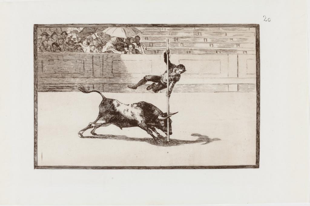 Dans les dernières salles, le violet domine, pour le vieux Goya sourd, d’abord retiré dans sa maison de campagne, puis à Bordeaux, où il meurt en 1828. Il devient ici le chroniqueur de la mort, l’église, l’arène et le carnaval étant les lieux où elle se célèbre. Dans la série La Tauromaquia, suite d’eaux-fortes de 1815 et 1816 représentant des corridas, il montre l’arène non comme un triomphe du courage viril, mais comme un cirque de sang et d’absurdité. C’est ce Goya qui inspira à Pablo Picasso sa propre Tauromaquia, dont plusieurs pièces sont ici mises en dialogue avec celles de Goya. Les mêmes images poussèrent l’expressionniste abstrait Antonio Saura, dans son style expressif quasi hallucinatoire, à mettre en scène des crânes torsadés et des crucifix.