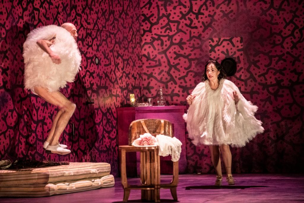 C’est un vaudeville moins connu, mais pur jus, les portes qui claquent et entresorts inutilement survoltés en moins. L’intrigue est classique: deux couples d’amis, les Pinglet et les Paillardin, le mari de l’un veut «serrer» la femme de l’autre… et réciproquement. Ces deux-là ont la libido en feu, contrairement à leur moitié. Les deux amants non consommés se donnent donc rendez-vous dans un hôtel de passe au poétique nom d’Hôtel du libre échange, géré par un concierge haut en couleur. On ajoutera à ça un ami veuf, venu de Valenciennes avec ses quatre filles, on agitera le tout avec une scénographie épurée –murs blancs ornés de la didascalie initiale en gros caractères noirs, des costumes décalés par les plumes et des comédiens ultraprécis, et on obtiendra un vaudeville certes très franco-français, mais dépoussiéré façon Stanislas Nordey.