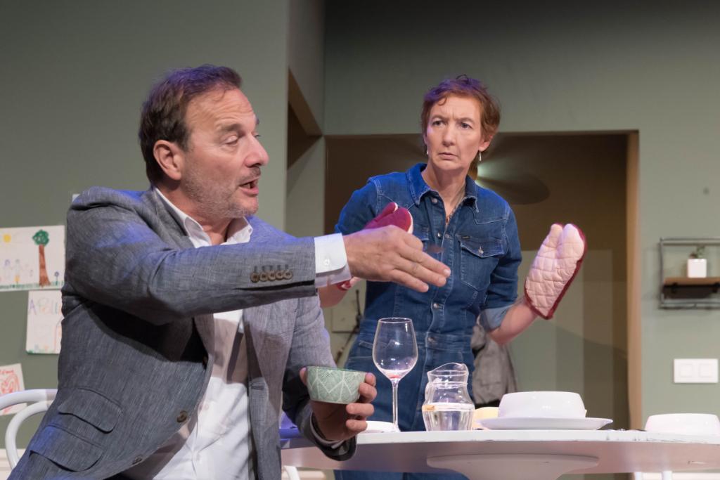 On connaît la musique… ou plutôt, l’intrigue. Celle du Prénom. Parce que des prénoms, il y en a de tous les styles. Des «classiques, des originaux, des courts, des longs, […] puis des prénoms qu’on n’oserait donner à personne. En particulier un prénom. LE prénom.» Le prénom, c’est l’histoire d’un fringuant quadra, Vincent (Patrick Ridremont) qui va être papa. Au cours d’une soirée entre amis, en attendant sa jeune épouse, il va dévoiler à ses amis d’enfance, deux autres couples, le prénom qu’il compte donner au nouveau-né. La pièce a déjà beaucoup tourné, donné lieu à un film, avec Patrick Bruel, et on retrouve tous ses ressorts dans le coquet cocon des Galeries. L’actualité du propos, c’est de faire de ces couples de bobos parisiens qui lisent Télérama et de leur soirée à visée amicale, une désintégration progressive, entre piques et trahisons dévoilées. C’est grinçant, heureusement distribué (Catherine Decrolier, Audrey D’Hulstère, Alexis Goslain et Frédéric Nyssen entourent Ridremont), et donc forcément redoutablement efficace. De quoi identifier ce qu’il ne faut pas faire lors d’un repas de fêtes.